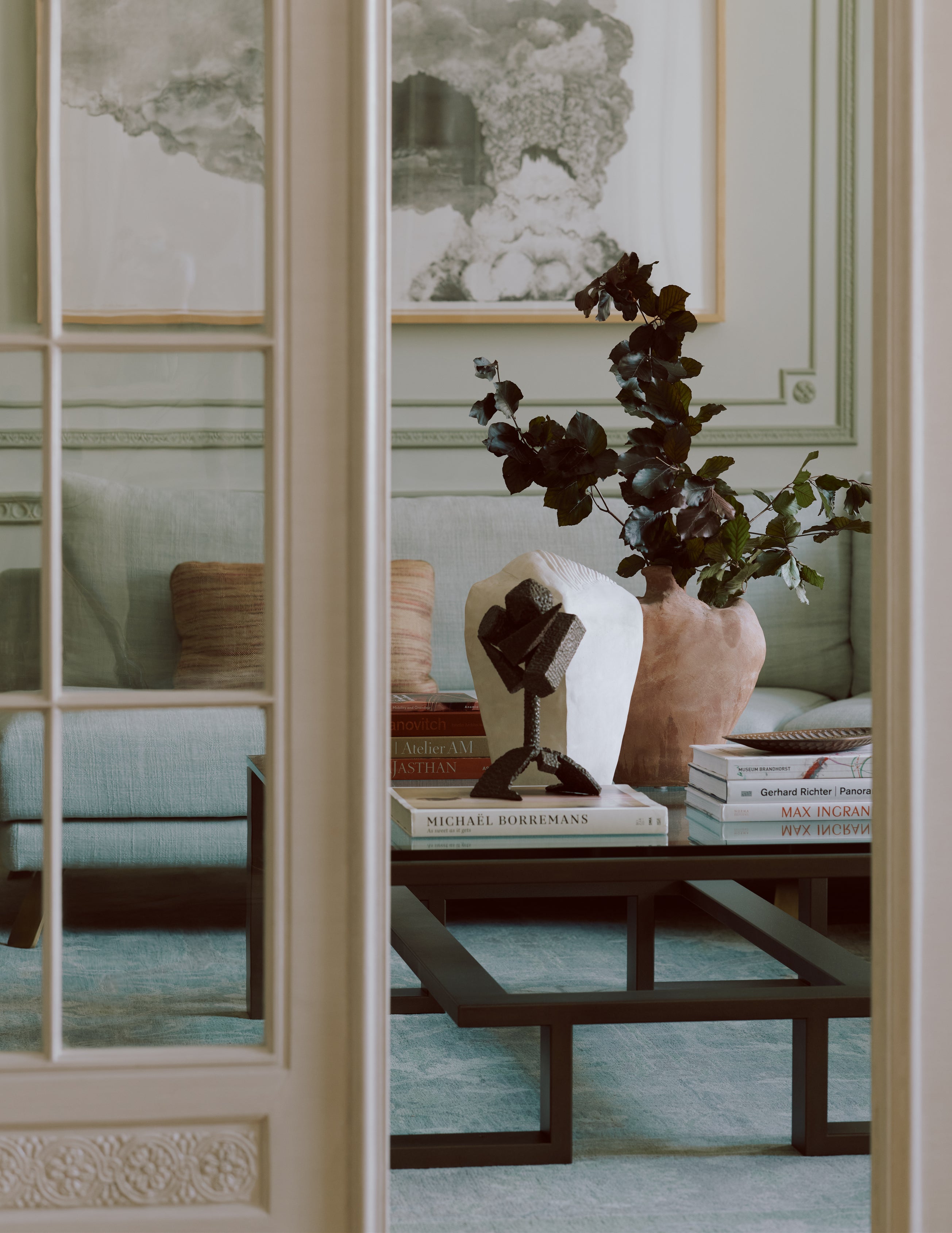 The library is a symphony of greens, velvety finishes, and opulent accents, beautifully enhancing the original mouldings. The richness of the materials creates a layered visual depth, immediately drawing you into its intimate yet luxurious atmosphere.