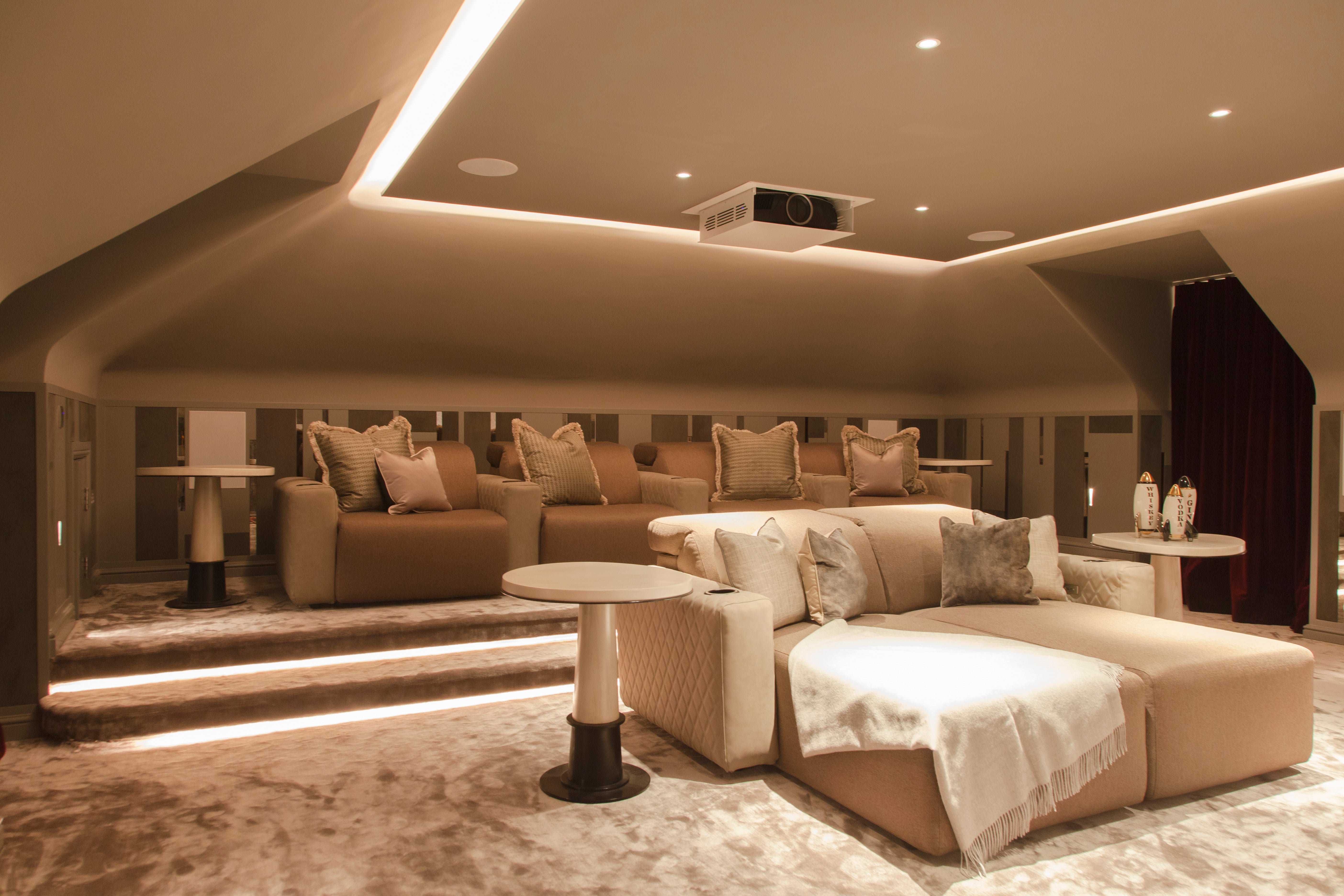 The top-floor cinema room is Aspen House’s true crown jewel, custom-designed to cater to the homeowner’s love for home-entertaining. Richly textured wallpapers in deep, warm hues envelop the space, adding a tactile element that complements the immersive viewing experience. Cinema chairs are tailored for ultimate comfort, featuring auto-adjusting backrests, illuminated cup holders, and upholstery in soft chenille.
