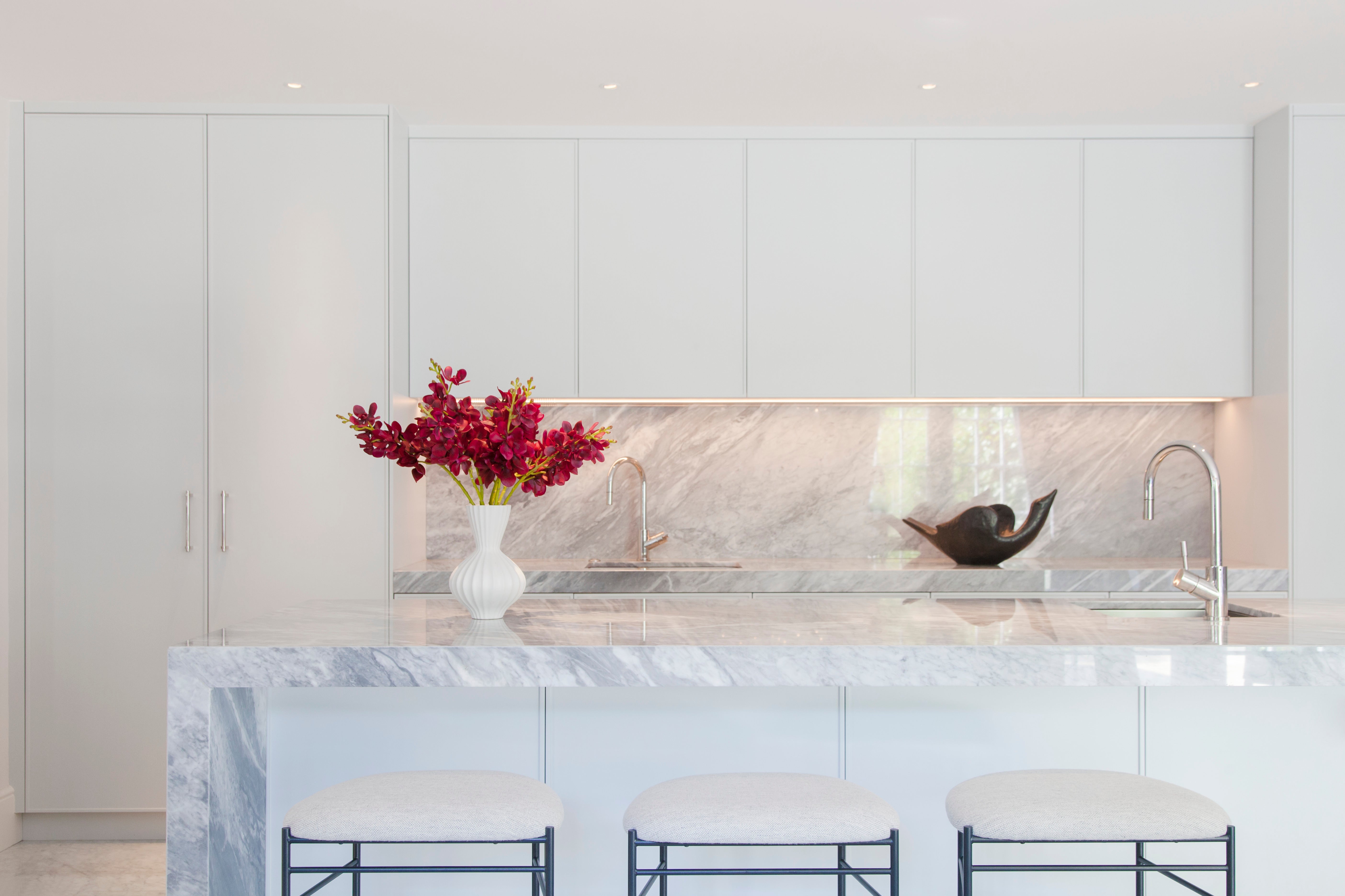 Reflecting both contemporary sophistication and subtle Nigerian influences, Callender Howorth crafted each room as a statement of warmth and hospitality. The entryway sets the tone with Arabescato marble floors, accented by dark grey trims that frame the space with perfection. Overhead, a custom glass chandelier dazzles, its colours inspired by a prominent artwork on the mezzanine, casting a warm and inviting glow throughout. This signature fixture, developed in collaboration with a specialist glass-blowing workshop, brings an exquisite handcrafted element to the home, seamlessly tying together colour, form, and lighting.