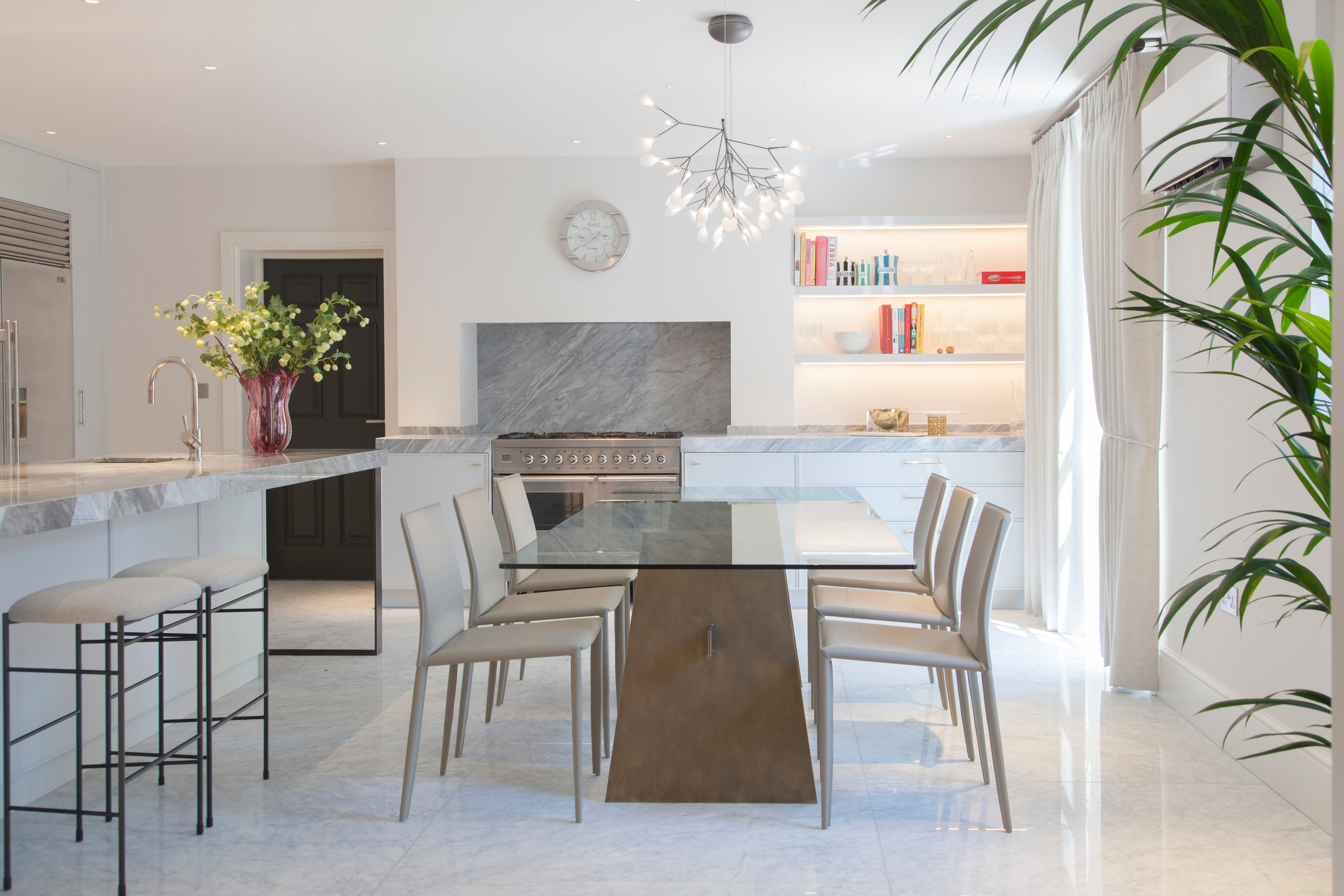 The kitchen-dining area features a minimalist palette of soft greys, marble surfaces, and sleek metallic accents, creating a refined and elegant atmosphere. The airy space is anchored by a sculptural glass-top dining table with a bold, geometric base, while the delicate branch-inspired chandelier above adds an organic glass that perfectly complements the room’s clean lines and natural light.