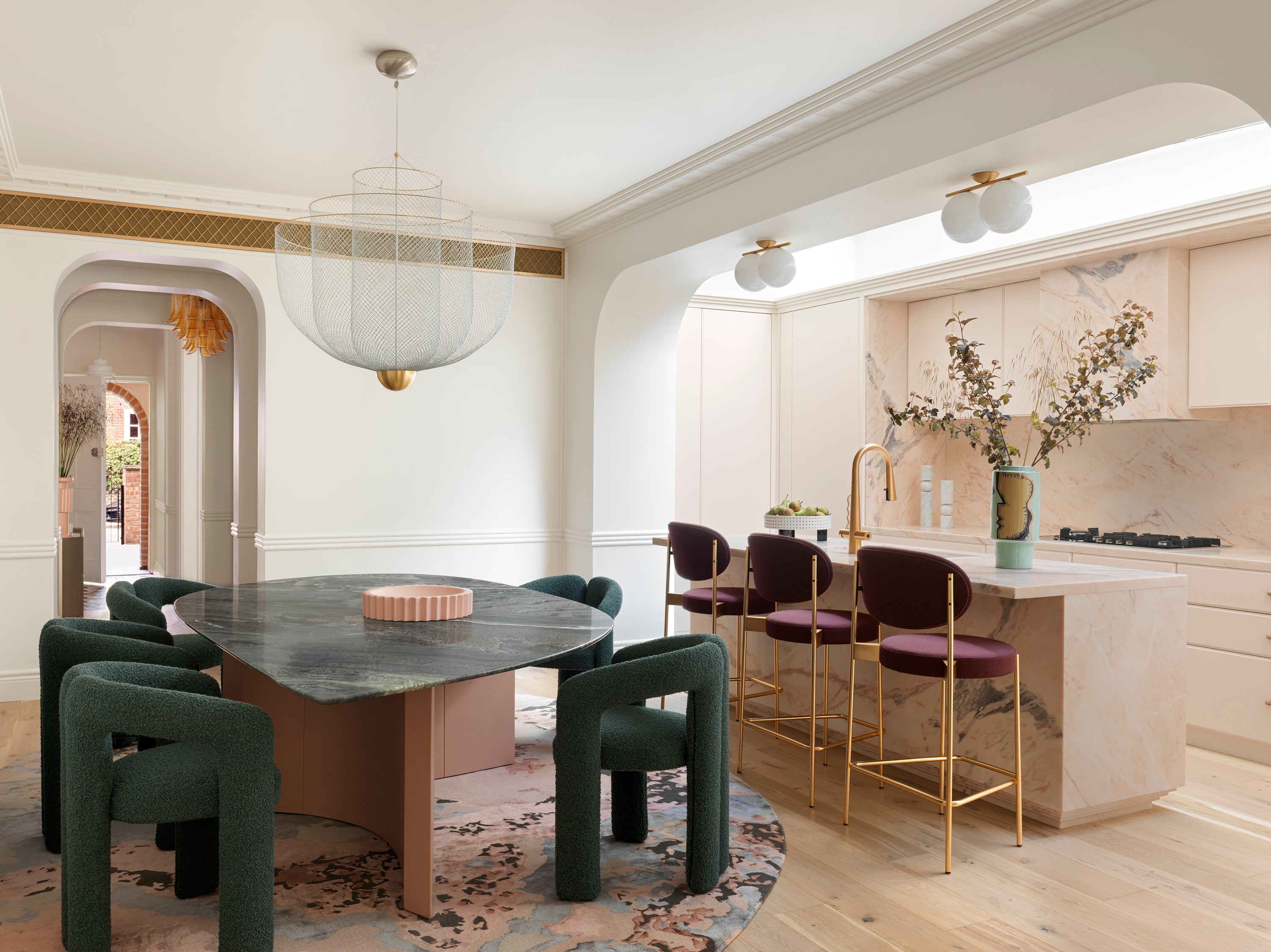 In the dining area, deep green boucle chairs surround a monolithic stone table beneath a mesh-like pendant that hovers like a soft cloud. Blush marble makes another appearance in the adjoining kitchen, where plum-hued velvet bar stools with gold legs echo the home’s refined yet glamorous atmosphere.