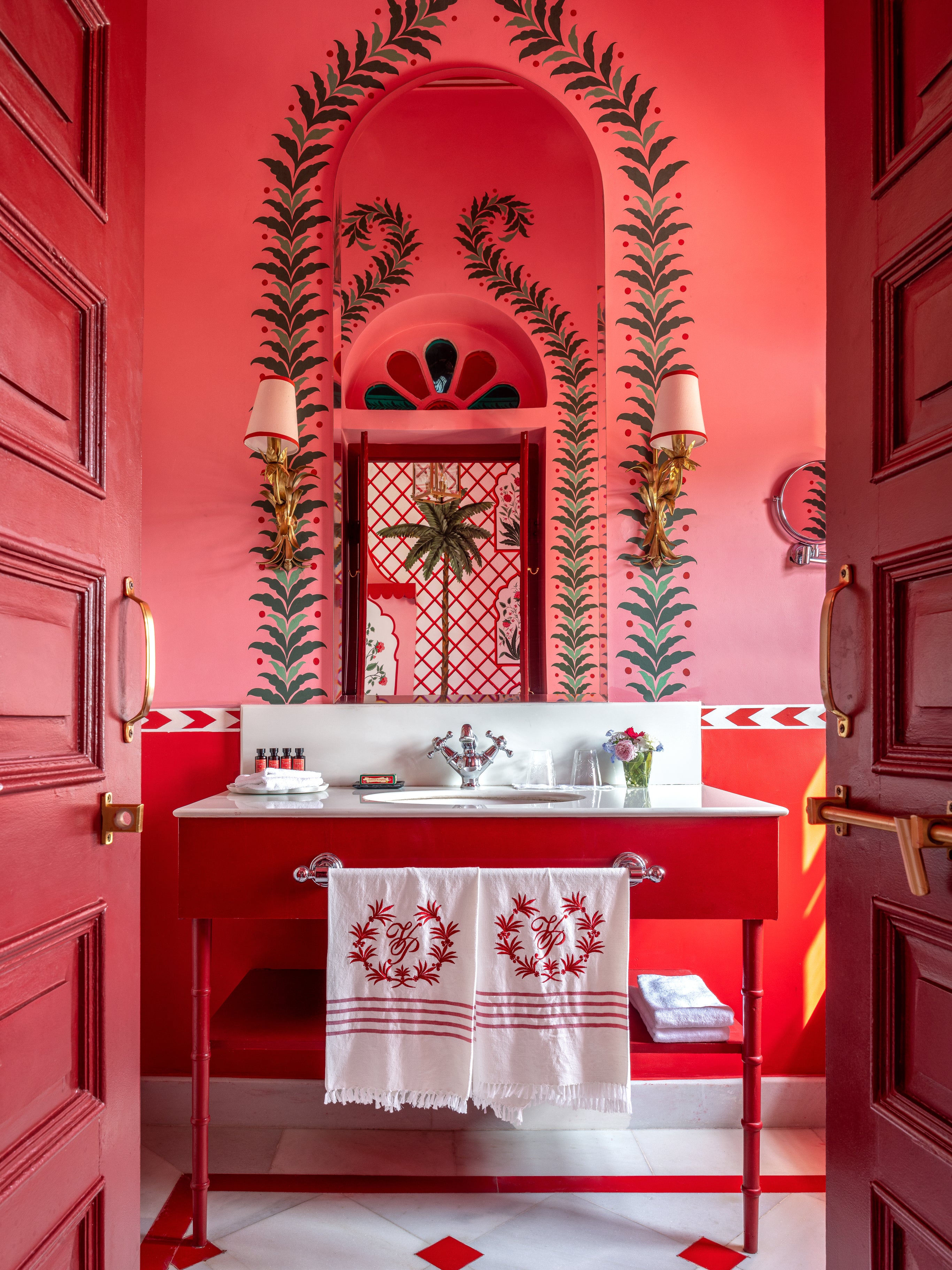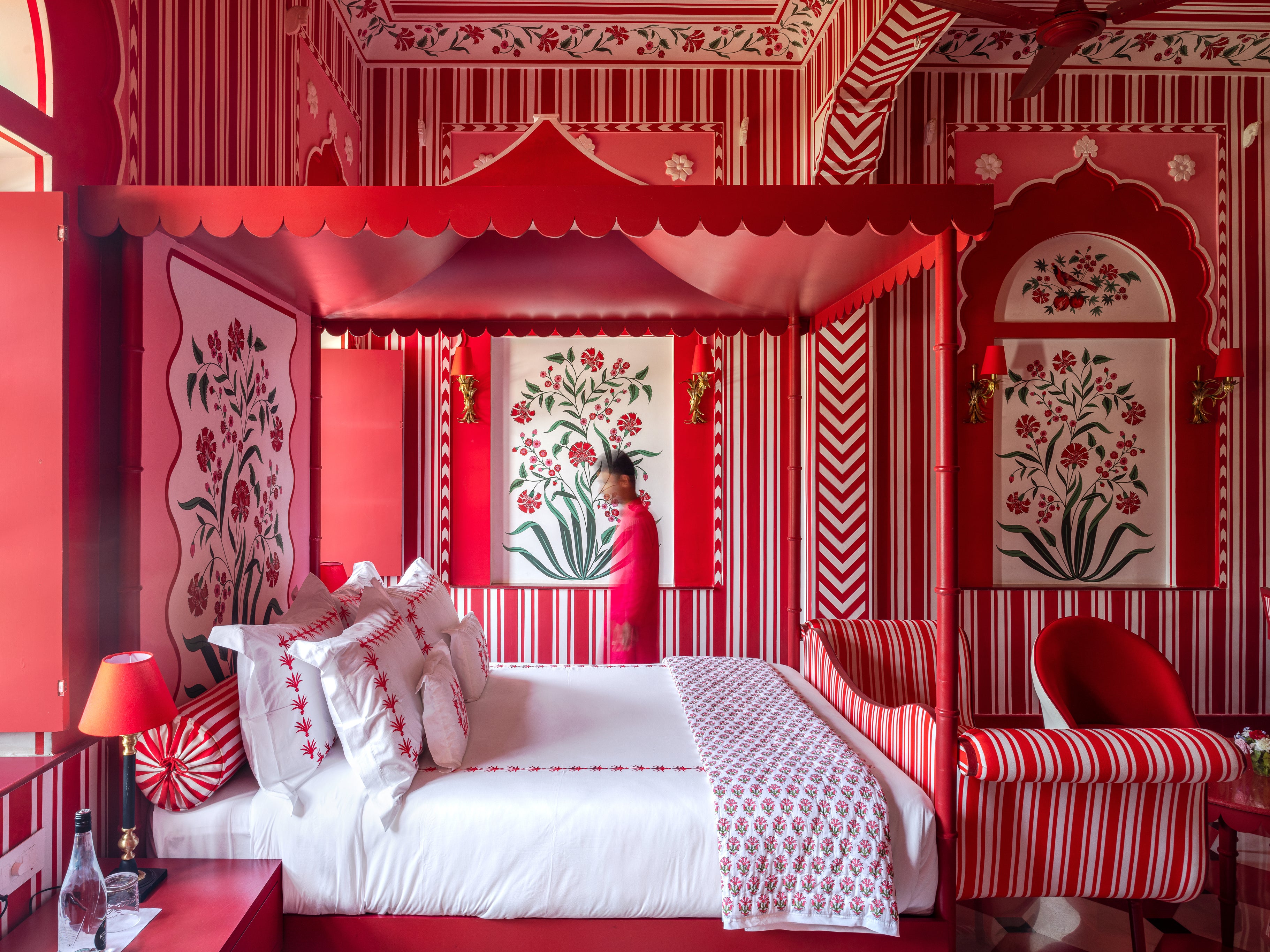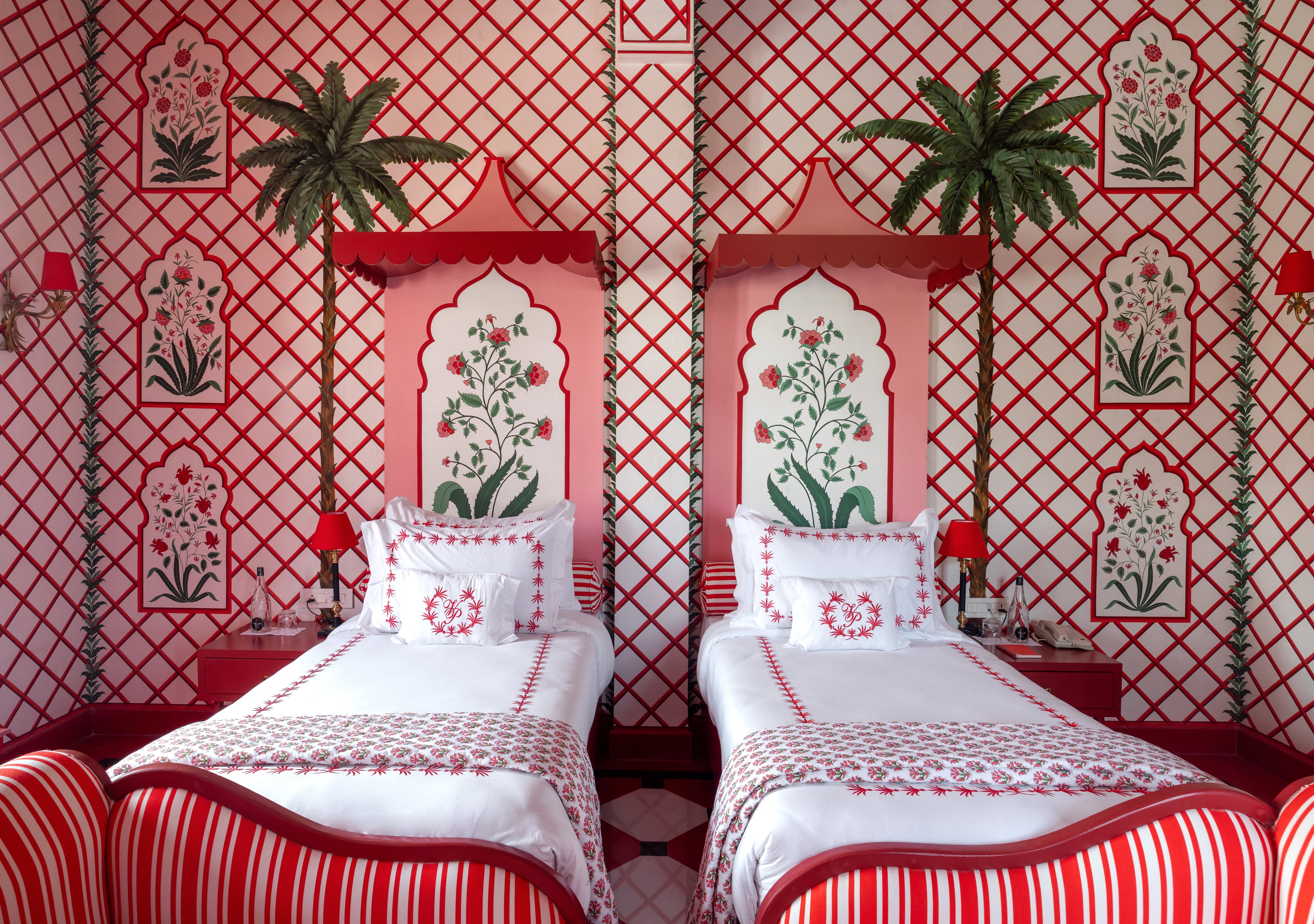 Housed in a former country estate, the villa has been utterly transformed. Every surface is painted, patterned, and pulsing with life. The designers drew from the architecture of Mughal gardens and Venetian palazzos, but the real magic lies in their palette, a riot of scarlet, vermilion, and carmine, punctuated by creamy whites and leafy greens. This intensity of colour, deeply rooted in Rajasthani symbolism, feels both regal and surreal.