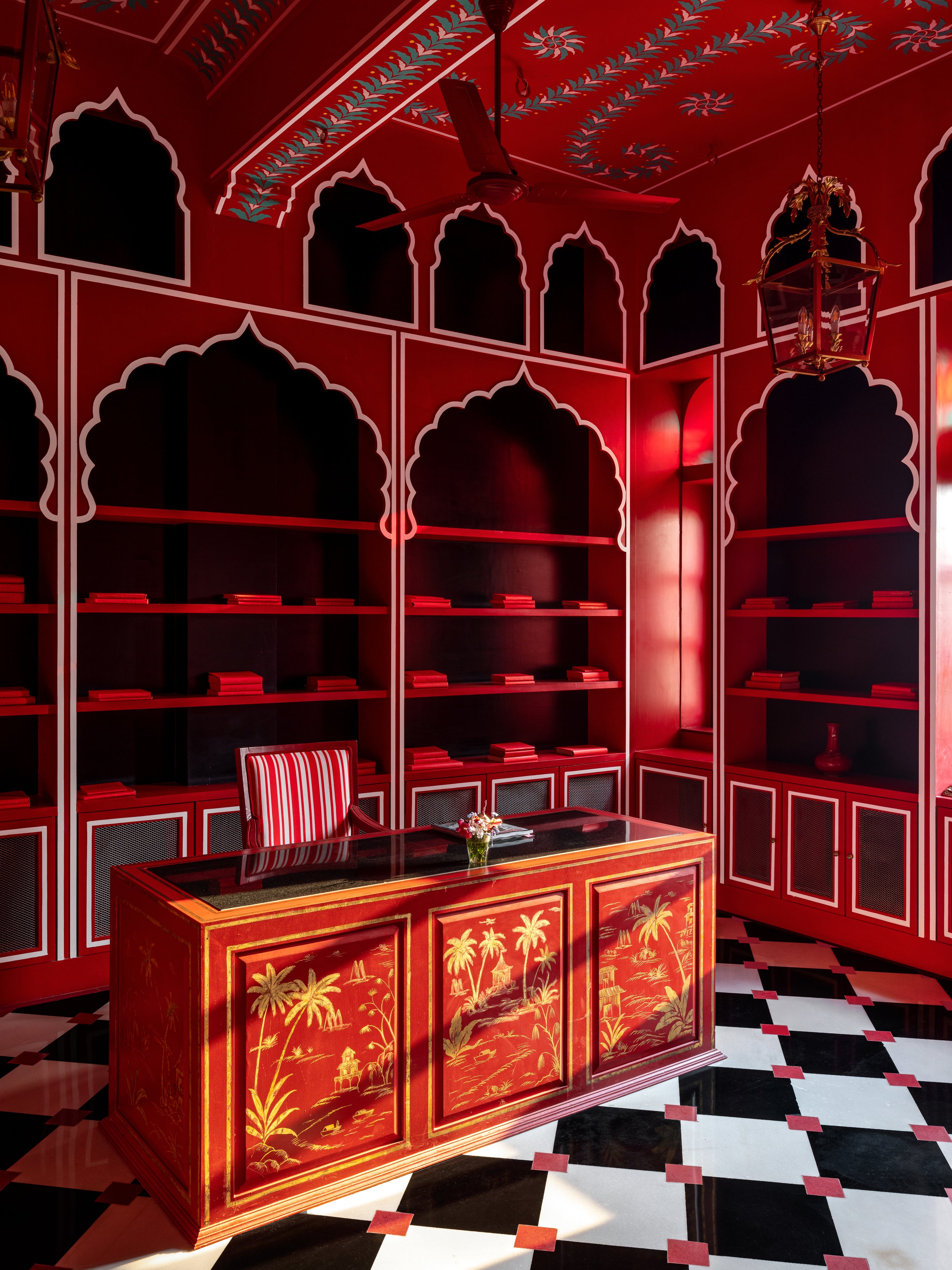 Inside, no two rooms are quite alike, but all are enveloped in narrative. Canopied beds are framed with scalloped arches; checkerboard floors ground soaring ceilings hand-painted with vines, florals, and geometric patterns. The level of detail recalls the miniature paintings of Rajasthan, where every inch of the canvas matters. In Villa Palladio, the same philosophy applies—walls, ceilings, doors, even lampshades are adorned.