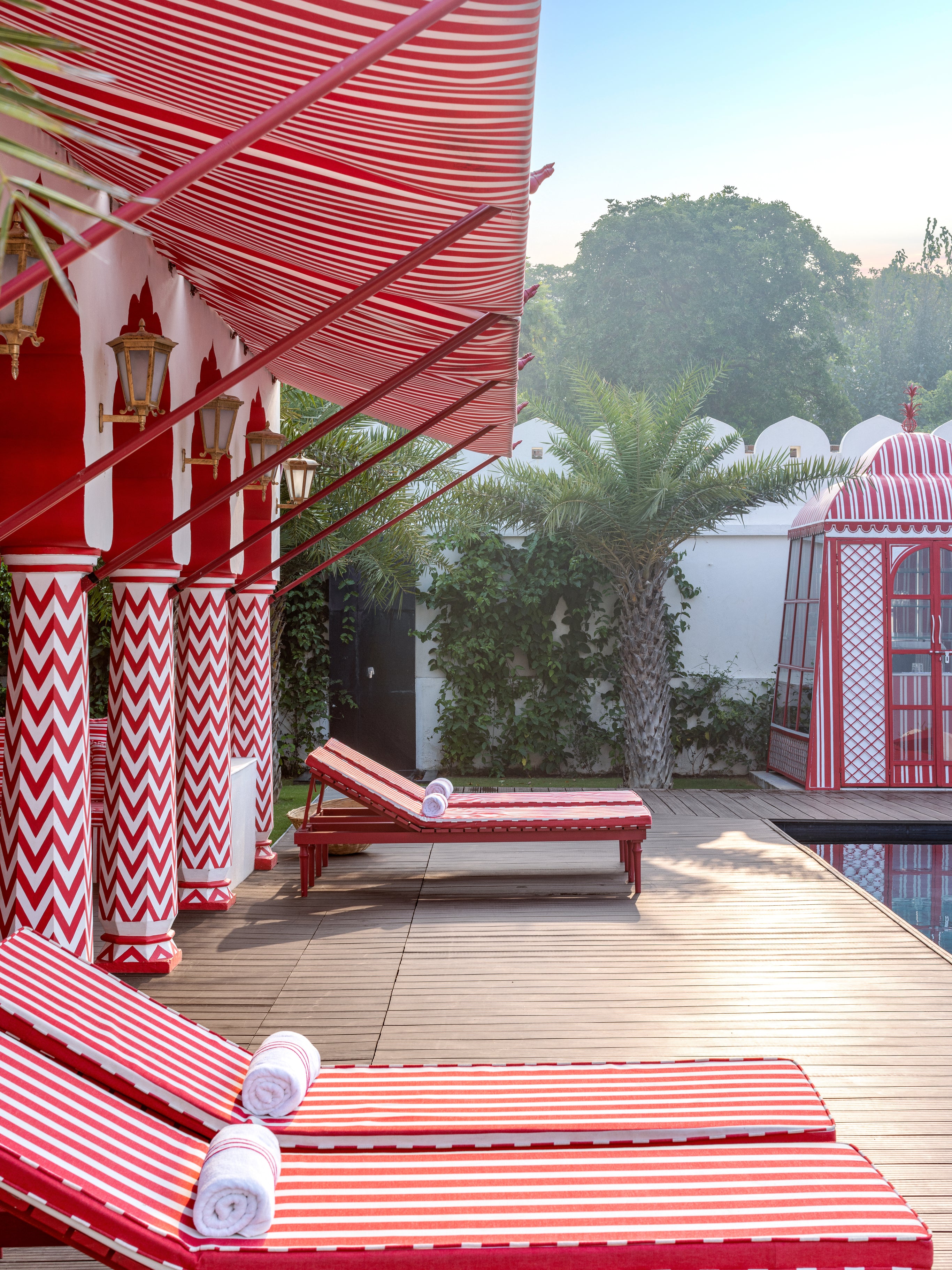 The library is a moody jewel box lacquered in deep crimson, while the dining terraces open up to scenes of pastoral calm, framed by colonnades and breezy verandas. But it’s the outdoor pavilion that truly captures the spirit of play: striped sunbeds, chevron columns, and whimsical canopies turn the pool area into a set piece straight out of a Wes Anderson film, filtered through the lens of Rajput romanticism.