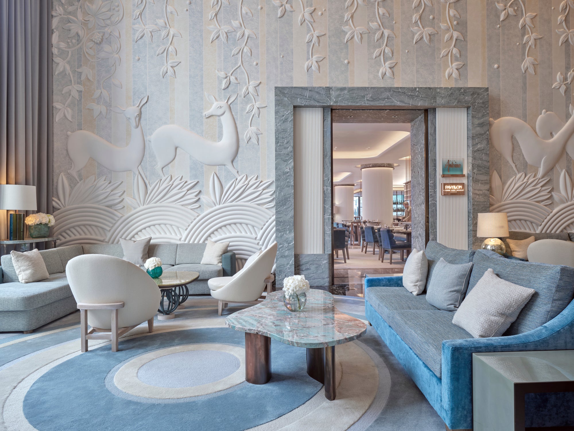 Chahan’s work at Pavyllon London showcases sculptural wall panels that evoke a surreal dreamscape. The relief of sinuous forms, abstract animals and lush botanical motifs adds a three-dimensional element, creating a tactile invitation for touch. The interplay of soft, pastel tones with subtle metallic accents furthers the sense of depth, while layered lighting and plush furnishings complete the cocoon-like atmosphere.